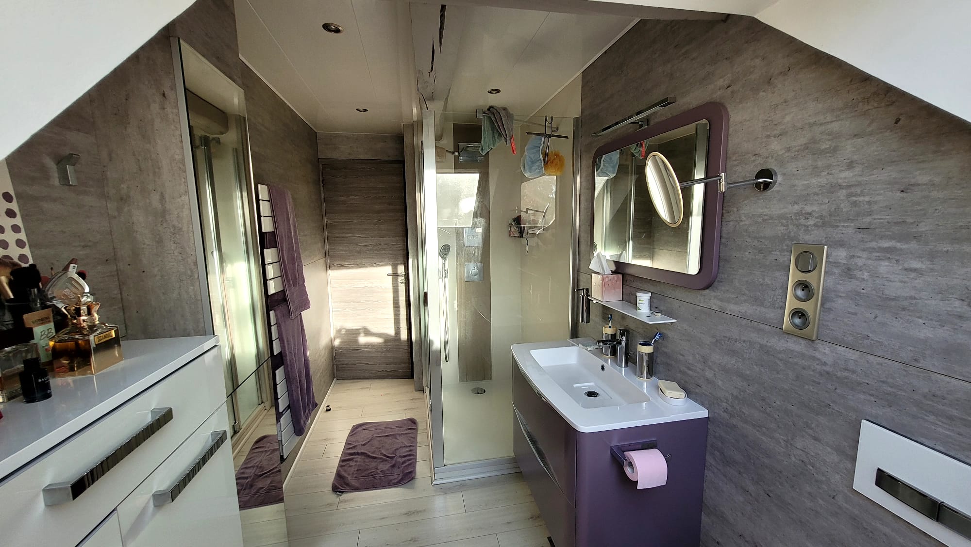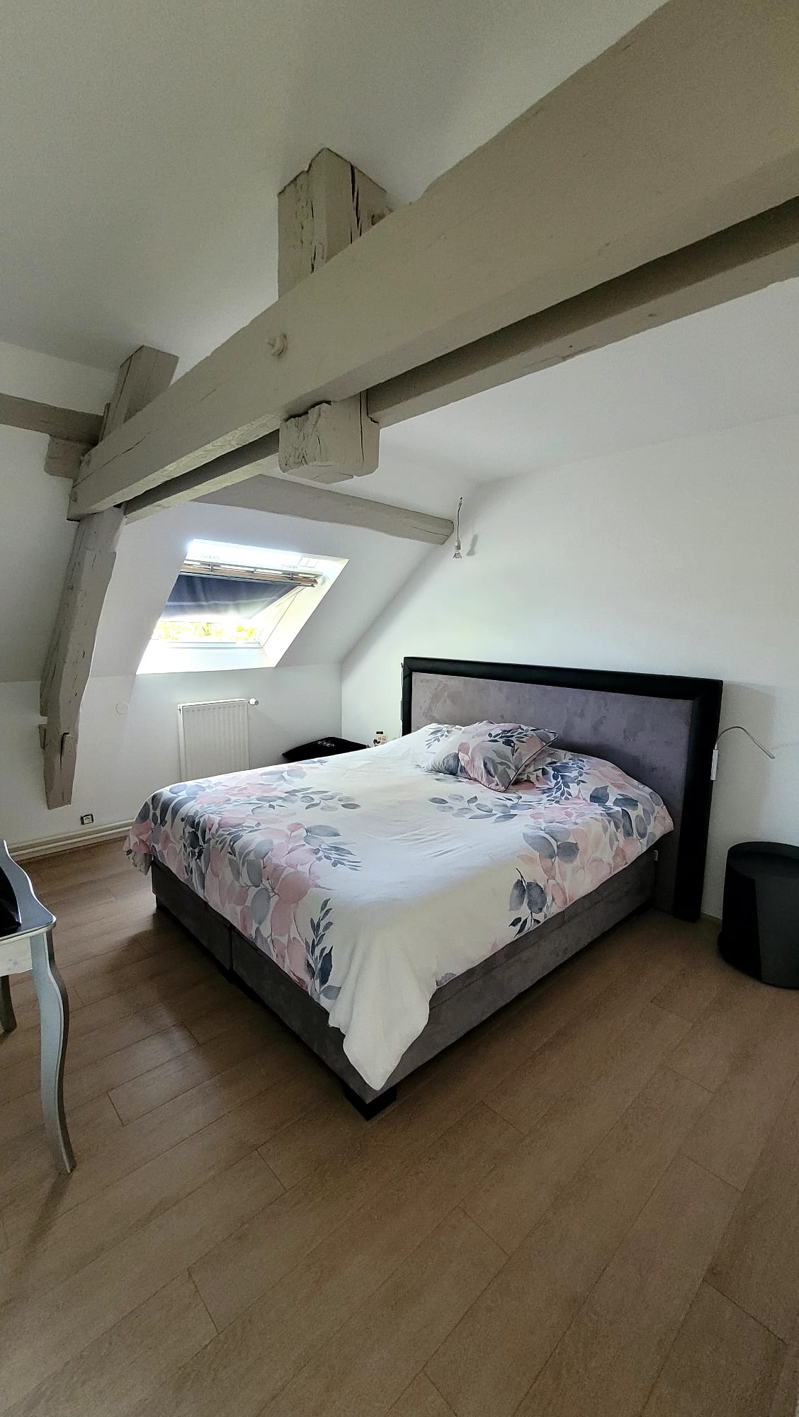 La première chambre sur la droite est une master room comprenant un espace nuit, un dressing aménagé et une salle de bain avec WC. Vous pouvez y avoir accès depuis l’escalier de la véranda.