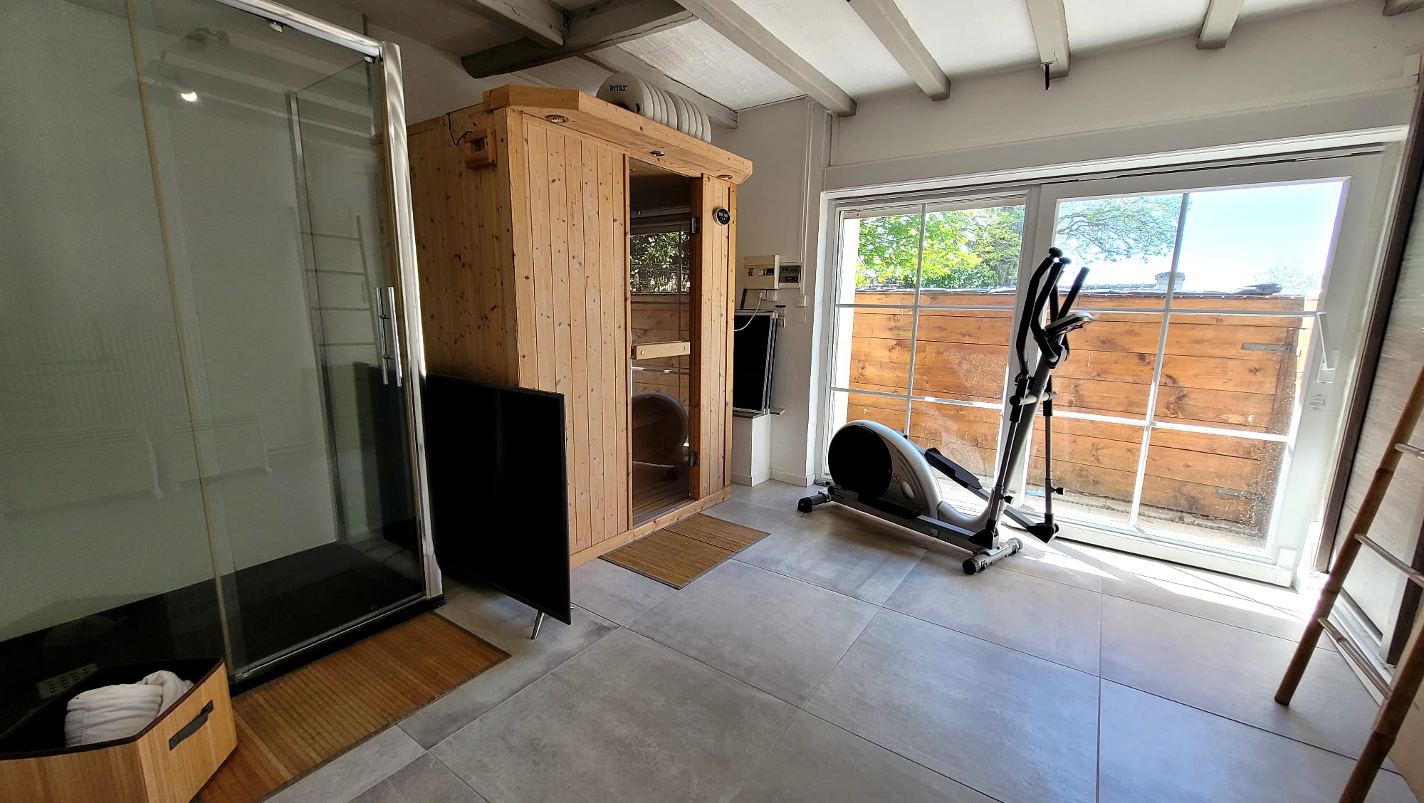 Un WC avec lave-main pour une intimité complète. Une salle de détente qui est un pool house. Sur l’arrière, une buanderie et chaufferie avec système de pompe à chaleur.